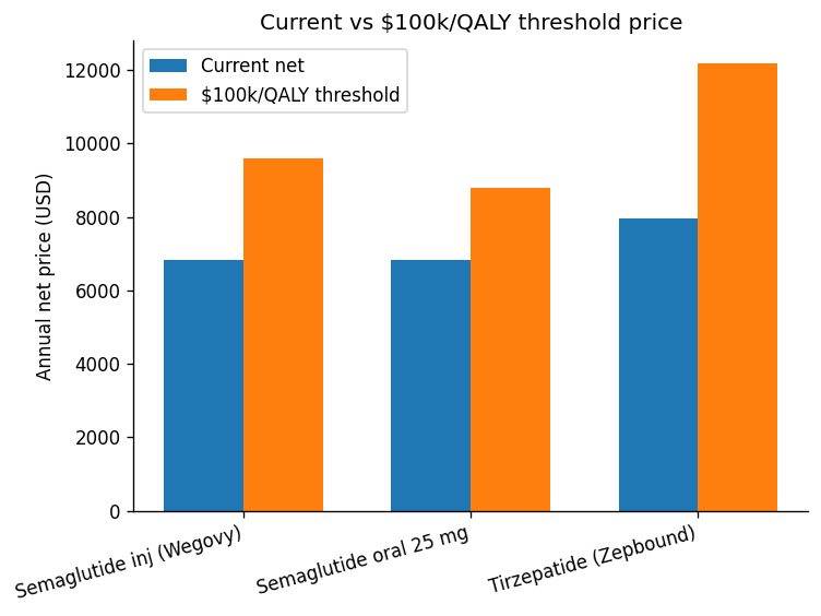 After rebates, insurers pay $6,800-$8,000 annually for GLP-1s (blue bars), close to ICER’s $100,000-per-QALY value threshold (orange bars). Trump’s $150/month pledge ($1,800/year) would represent an 73-78% cut from these net prices, pushing costs well below what health economists consider cost-effective for obesity treatment. Source: ICER